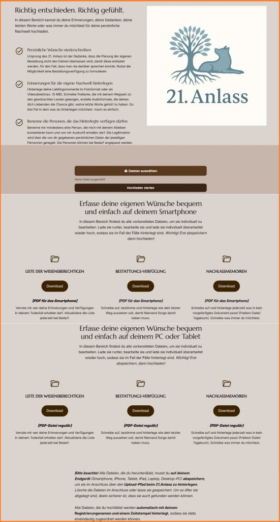 Erfahre in einfachen Schritten, wie du bei 21.Anlass deine persönlichen Erinnerungen, Dokumente und Wünsche sicher hinterlegst und deinen Angehörigen wertvolle Unterstützung in schweren Zeiten bietest.