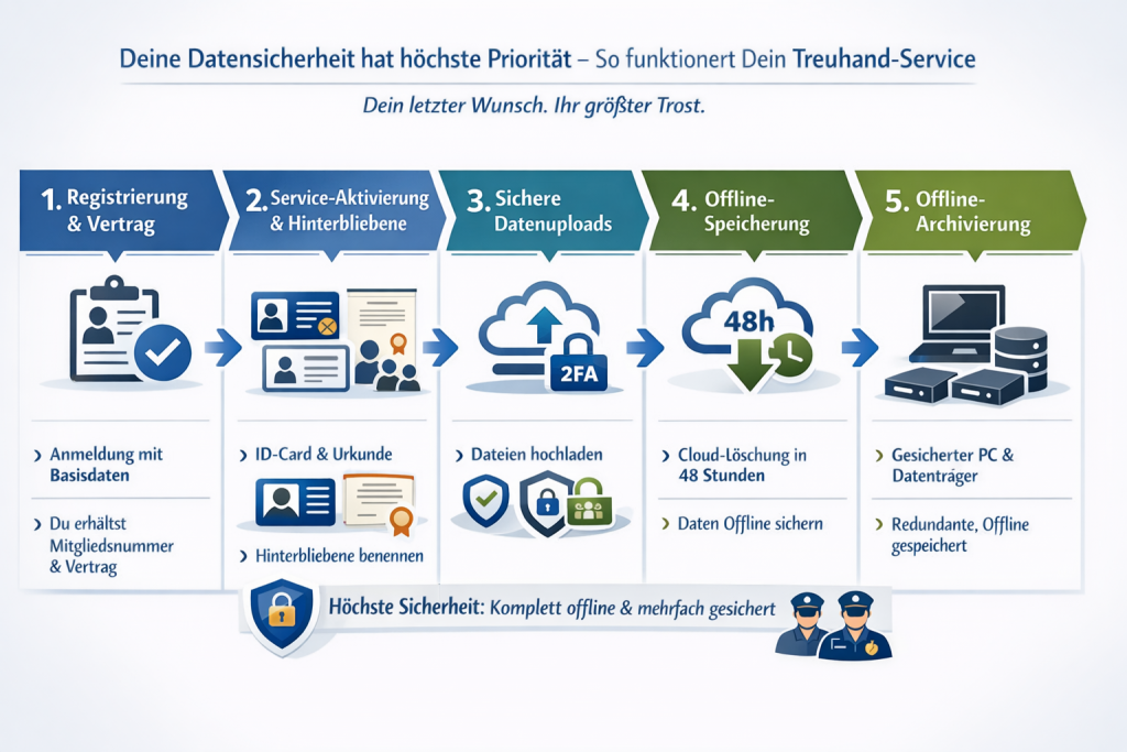 Mit einem digitalen Treuhanddienst kannst du persönliche Wünsche, Erinnerungen und Daten sicher für den Todesfall hinterlegen und deinen Angehörigen Klarheit und Trost schenken.